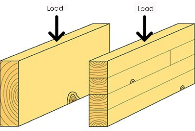 The lamination effect for glulam: In glued laminated timber, there is only a very small risk of defects, such as large knots, occurring in the same section. However, a single knot can significantly lower the strength of a solid wooden beam.