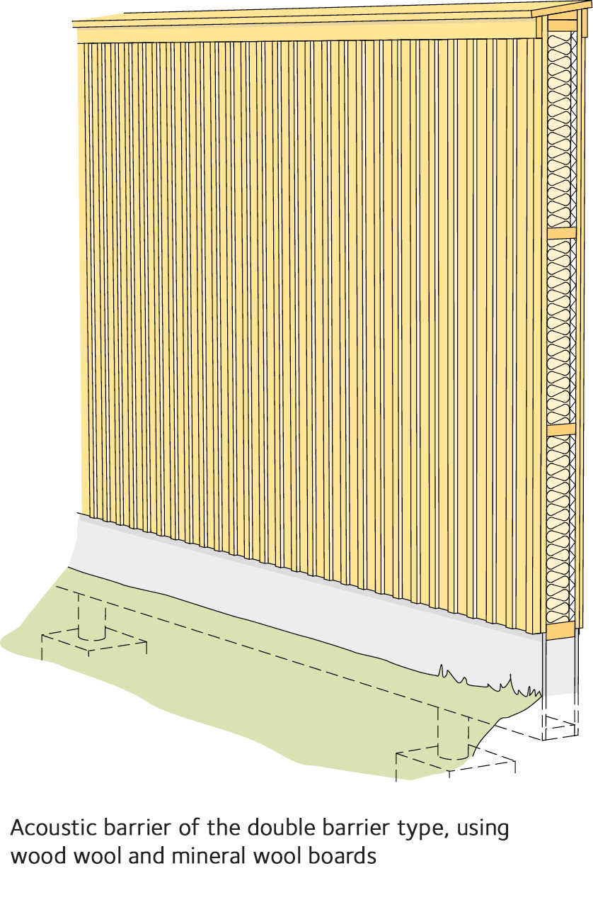 In practice, a reduction of at least 20–25 dB is required. This can be achieved with wooden structures, particularly where barriers with double panels are used.