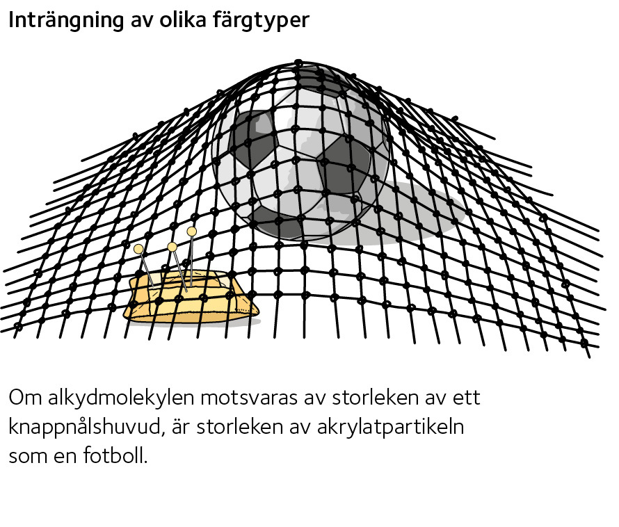 If the alkyd molecule is equated to a pin head, the acrylate particle is like a football. In this comparison, the wood’s pores are like a net with 20 mm openings. The illustration clearly shows that the alkyd molecule (the pin head) can easily make its way through the wood (the net) while the acrylate particle (the football) cannot.