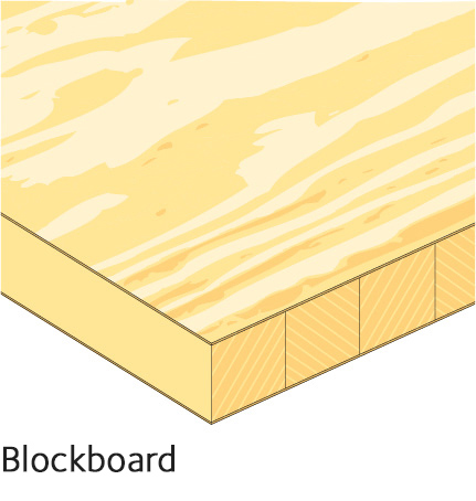 Blockboard is described according to the base material (pine staves for example) and the type of surface layer (veneer, fibreboard, melamine). An example is “laminboard” which is finished with a hardwood laminate.
