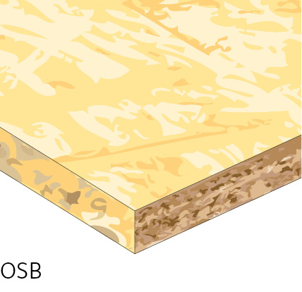 OSB (Oriented Strand Board) can be recognised by the large, flat wood shavings that can be seen even on the surface of the board. The boards are particularly resistant to corner breakage. Just like plywood, OSB has a clear main orientation. The wood shavings near the surface follow the length of the board, while the shavings in the mid-section are perpendicular to the length. The shavings may be softwood or hardwood. The adhesive can be phenolic resin in powder form or melamine adhesive. OSB is used in applications such as walls and packaging.