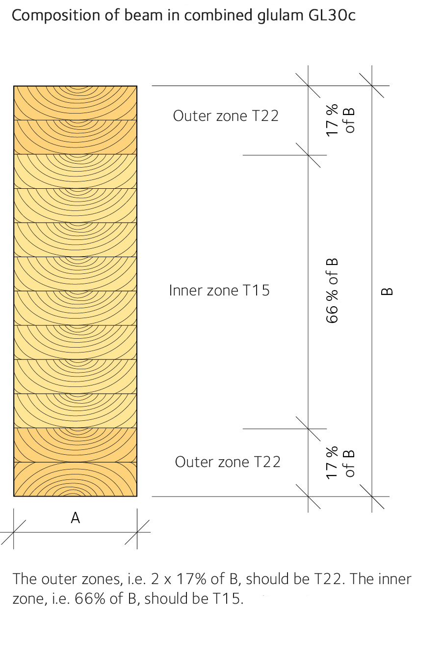 Combined glulam has at least four layers and is specified using the letter c. Glulam in strength class GL30c comprises laminates of strength class T22 in the outer zones and strength class T15 in the inner zone. For combined glulam in strength class GL30c, the outer zone laminates must be 2 × 17% of the cross-section height h.