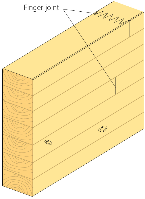 Glulam structural elements are manufactured industrially under controlled conditions. Large lengths can be achieved using finger-jointing technology. The principle of production is that finger-jointed laminates of wood are stacked up in layers and glued together into large structural elements. The wood fibres are oriented in the direction of the glulam products’ length. The size and length of the glulam products are limited in the first instance by transport options and in the second instance by the glulam manufacturer’s production site and equipment.