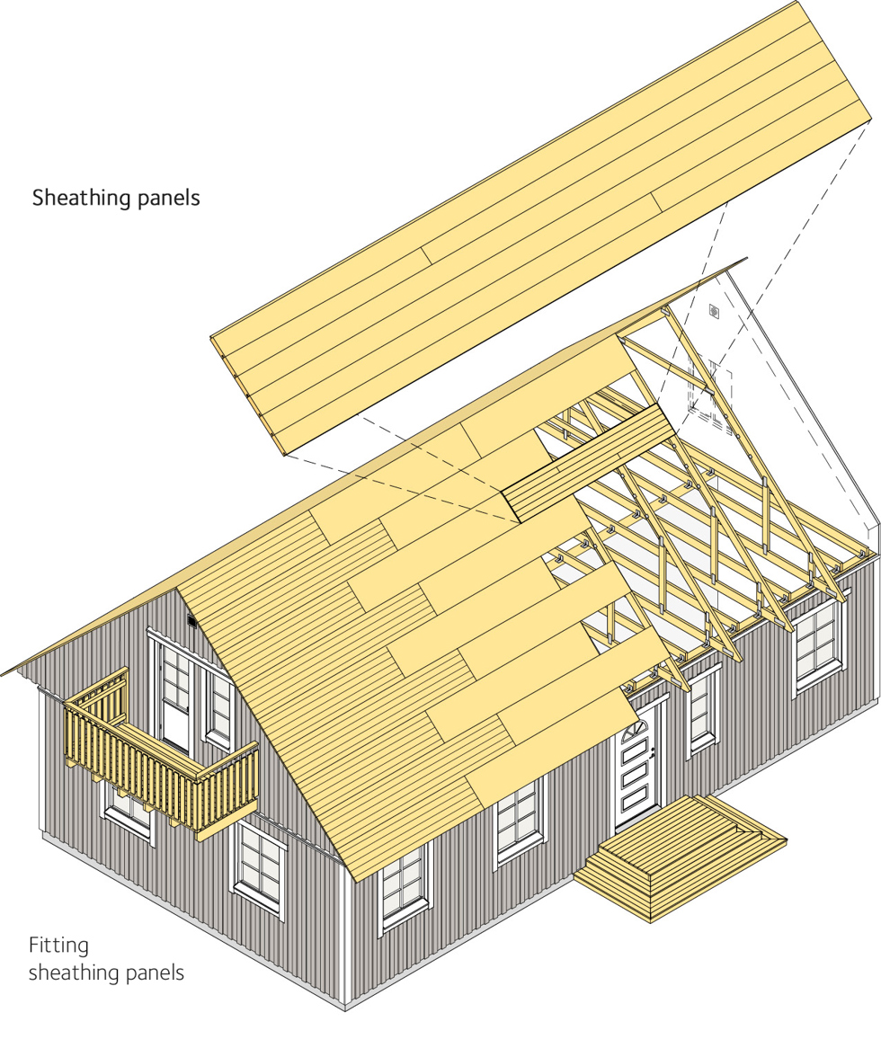 Tongue & groove sheathing panels should be connected with a butt joint over a support. Some tongue & groove sheathing panels are type-approved for resistance to failure when stepped on. See also www.vilmabas.se. Tongue & groove sheathing panels are supplied untreated or industrially primed with a target moisture content of 16%.