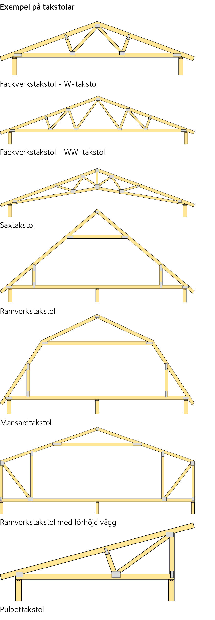 Roof trusses are usually manufactured industrially as finished products and must be CE-labelled according to the standard SS-EN 14250. The wood used is construction timber, usually 45 mm thick.