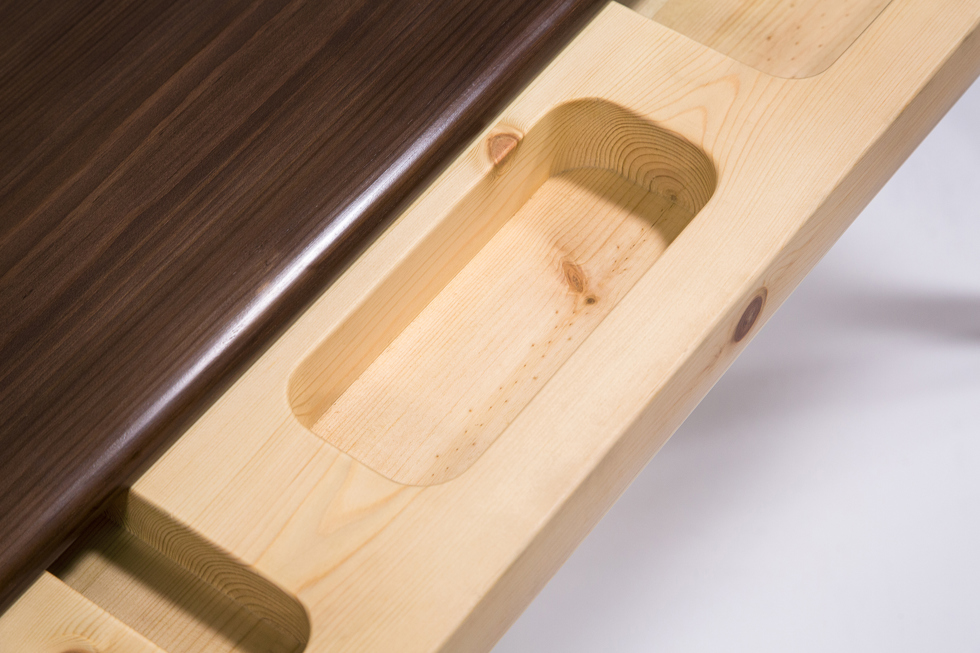 During the trip in Sweden, Wu Wei was fascinated by the lakes in the forest. When he designed the table using Swedish pine, he dug some “lakes” on the table top for the storage of paper, pens, books, iPad and even a socket instead of making drawers. A sliding cover and the legs are stained brown.