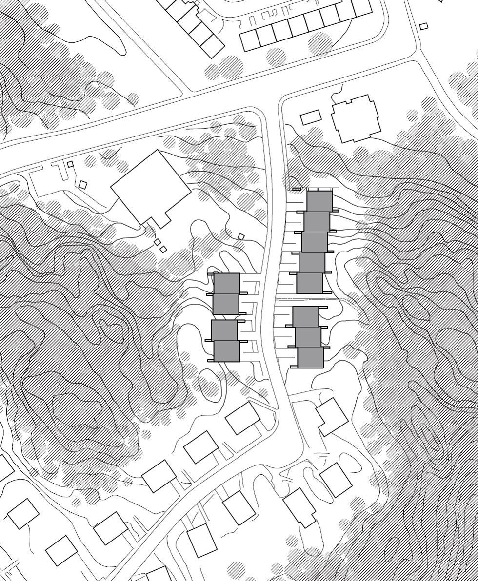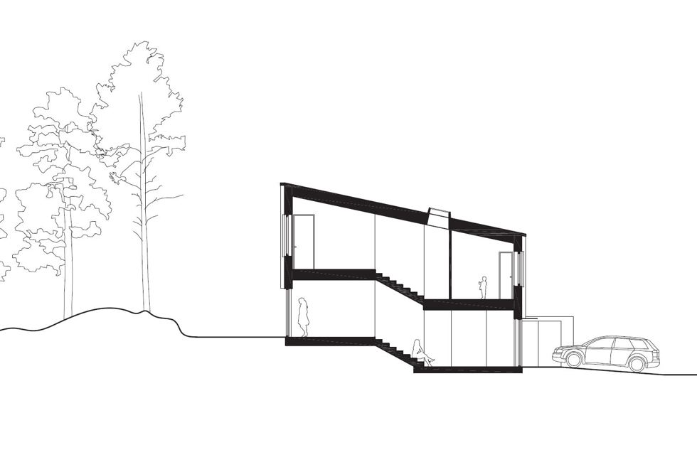 This terraced house project is a fine example of densification in a built environment. The building volumes fit comfortably on the edge of the nature reserve. Here the interior rooms provide a conduit between nature and the staggered streetscape.