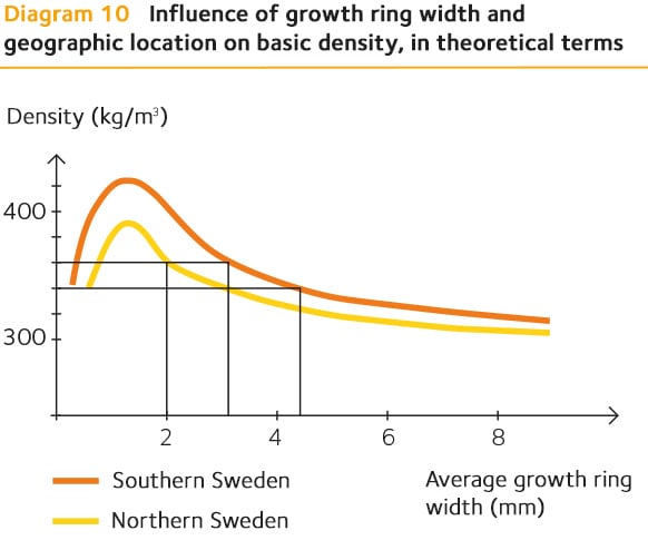 Fig. 25 Influence of growth ring width and geographic location on basic density, in theoretical terms Wood from southern Sweden is denser, stronger and more durable than wood from northern Sweden. This is despite the fact that southern Swedish wood generally has broader growth rings than wood from northern Sweden. The reason for this is that the summerwood band, the dark part of the growth ring, is wider in southern Sweden. Summerwood, which weighs 900 kilos per cubic metre dry wood, is three times denser than springwood, which weighs 300 kilos per cubic metre dry wood.