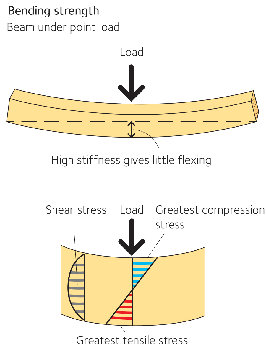 Stiffness and hardness may also be included in the strength properties. Stiffness is the opposite of bending or deformation. When a length of wood with high stiffness is bent, it doesn’t give very much, remaining quite straight. The degree of bending depends on the grain of the wood and on its modulus of elasticity. A high modulus of elasticity means high stiffness.
