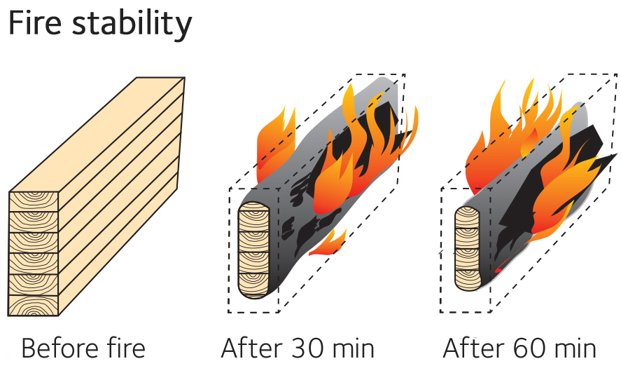Wooden structures have good fire safety properties. Wood chars slowly and below the charred surface is normal wood, which retains its original properties. The charring rate is around 0.5–1.0 mm per minute. Larger dimensions and protection of the wood’s surface can enhance a wooden structure’s fire resistance.