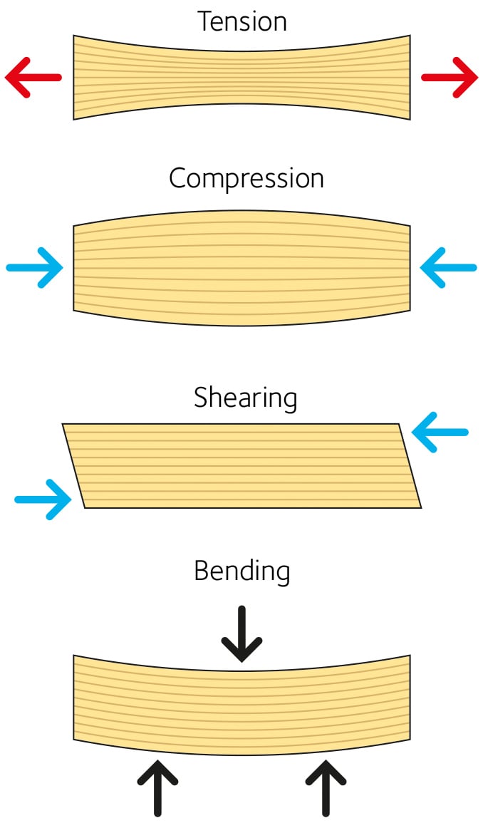 The strength depends in part on the density of the wood and on how well the direction of the fibres matches the direction of the forces that arise when the wood is under stress.
