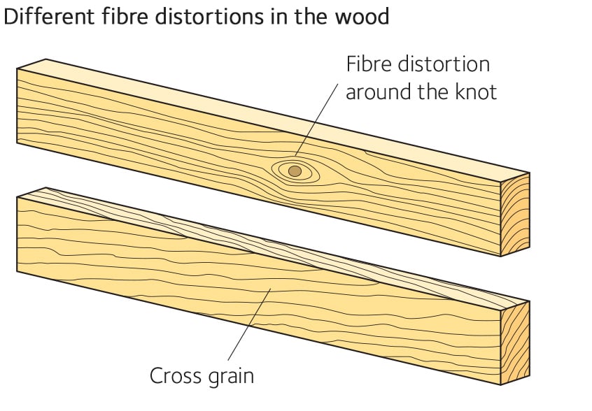 The fibre direction deviates from the direction of the forces at knots and when the fibres are not parallel with the edge of the wood.