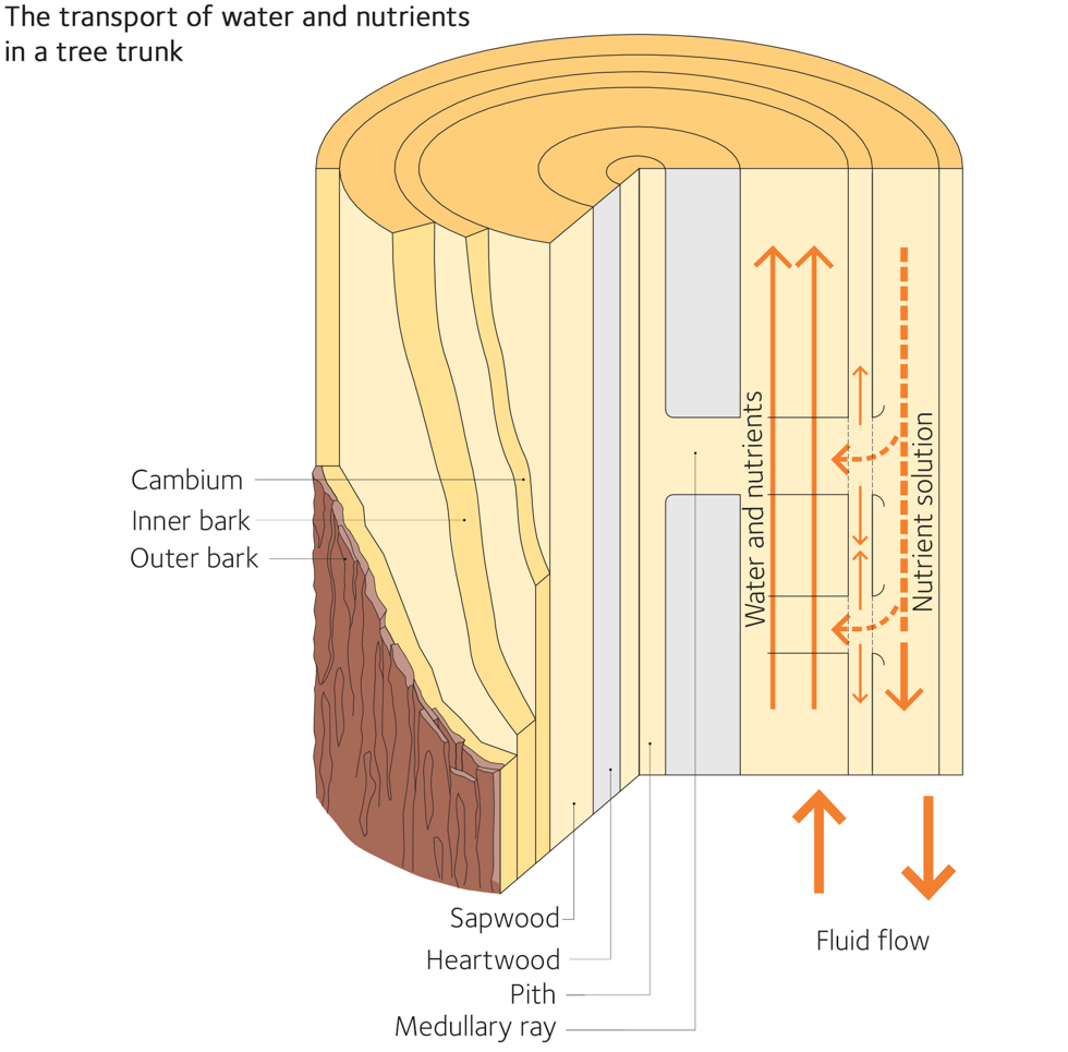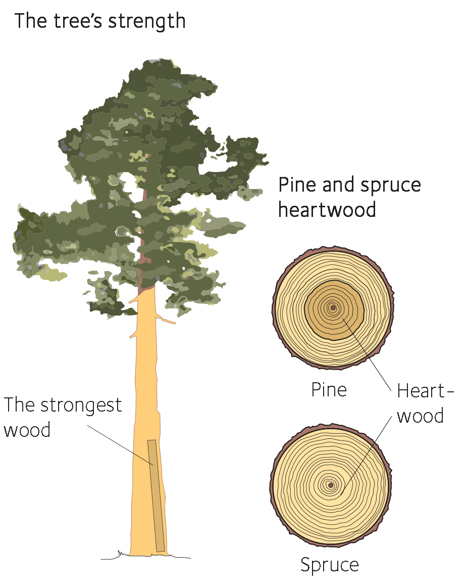 Pines and spruces have a similar composition. In the centre of the stem’s cross-section sits the pith, which runs through the whole tree and terminates at the top with a bud. The pith is enclosed by the wood, which can be divided into the heartwood and the sapwood, which is closest to the bark. The cells in the heartwood are dead and some have been clogged up with resin, which means that they can’t carry water and thus have a relatively low moisture content, 30–50%. The sapwood’s cells are also dead, except for about 5–10 percent, which are the nutrient-carrying parenchyma cells.