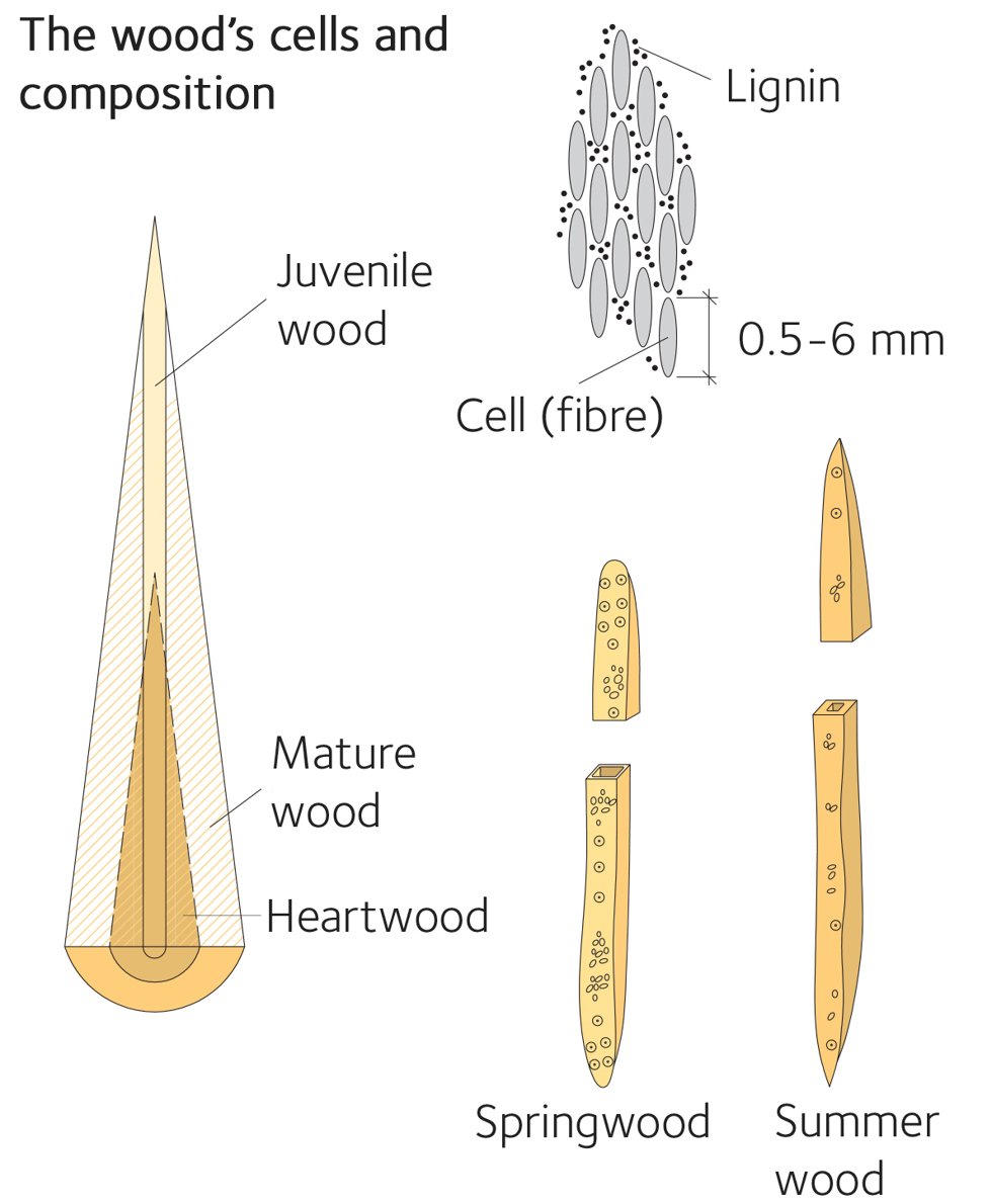Material properties vary between the different wood species. Even within the same wood species, there are major variations between trees grown in different locations, but also between different trees grown in the same location. There is, however, even greater variation within a single tree; for example between different heights in the tree, between wood that is close to the pith and to the bark, and between springwood and summerwood in the individual growth rings. Knots and other fibre distortions (peculiarities) also affect the wood’s technical properties.