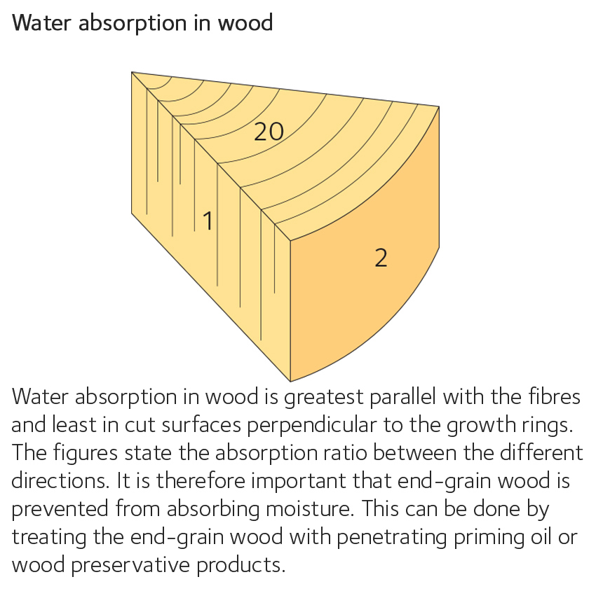 Wood that is to be painted on the construction site should be primed as quickly as possible to protect against UV radiation, and the surface moisture content should be max 16% when painting. It is recommended that exposed wood such as external cladding and interior casings should be given an industrial surface treatment in accordance with the third-party certified quality assurance system CMP (Certifierad Målad Panel = certified painted cladding). External cladding that is primed at the construction site should have a film thickness, expressed as the amount of paint applied per square metre, averaging at least 60 μm (micrometres) as a dry layer.