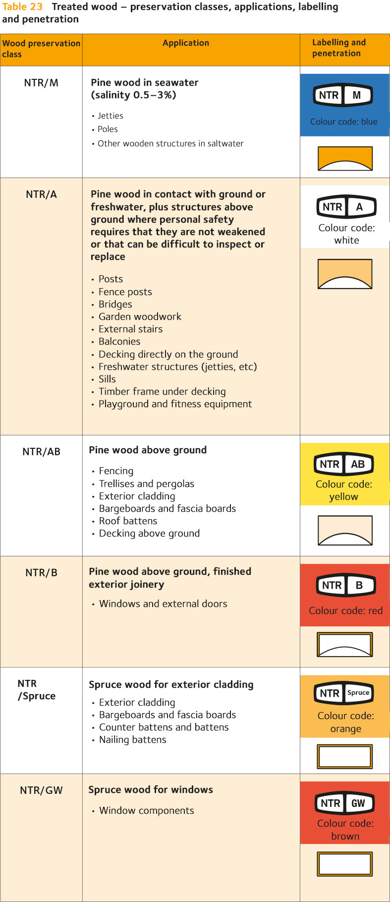 Table 14 Treated wood – preservation classes, applications, labelling and penetration