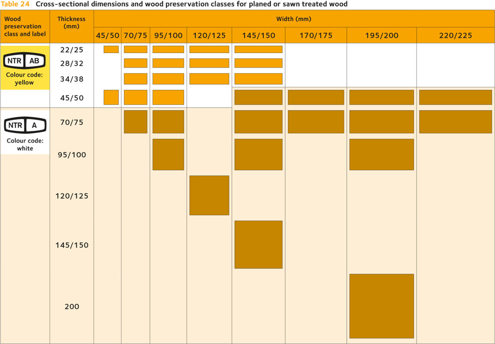 To facilitate the handling of pressure-treated wood at the retail stage and during construction, products in the wood preservation classes NTR AB and NTR A are also supplied in different dimensions. Products with slimmer dimensions up to a thickness of 38 mm and those that are 45 mm thick and 125 mm wide are used mainly above ground, and are produced to comply with NTR AB. Larger dimensions are used in contact with the ground or freshwater or in critical structures, where NTR A is needed. See table 15.