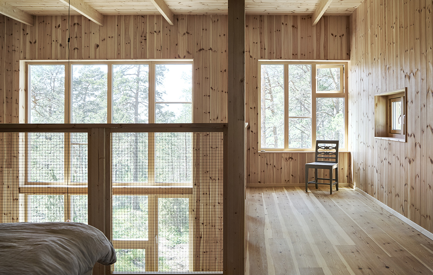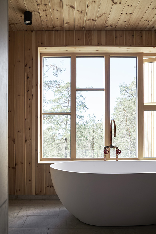 Villa Lake/Streich can thus be considered the first instalment ready to be added to: a base station made entirely of pine, oiled in places but mainly untreated. In the kids’ section, the curtained box beds in the simple cabins of Dalarna prompted the idea of sleeping alcoves, which are like a private room within a room. This feeling is accentuated by the different ceiling heights, and Martina Eriksson has also taken great care to create intermediate zones.