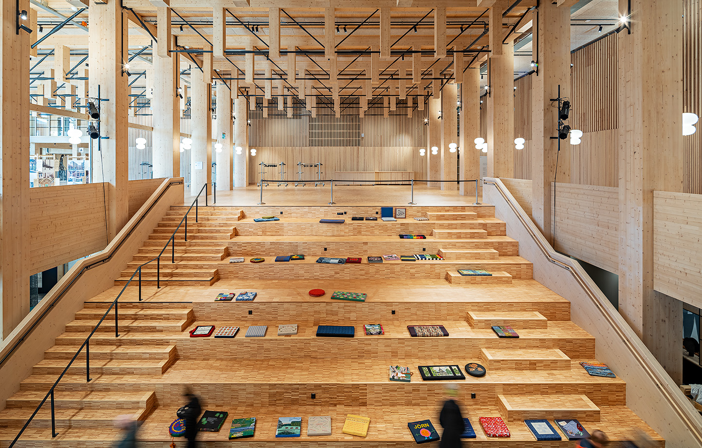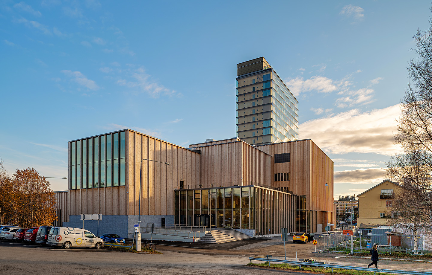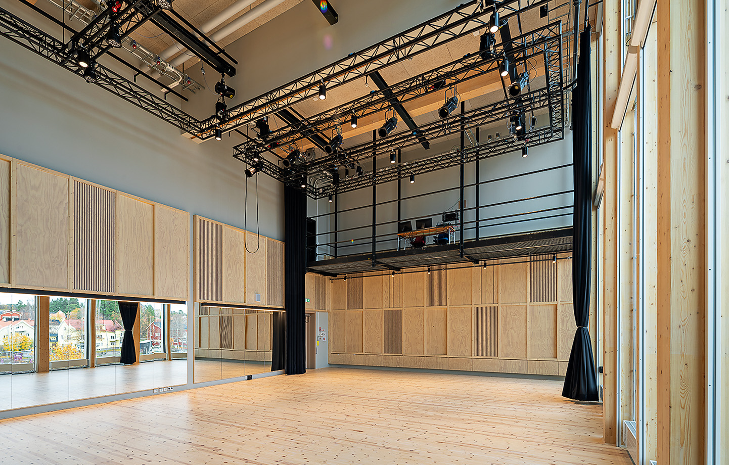 The lower section of the building, which houses the arts centre, comprises a prefabricated structural frame in CLT and glulam. The diversity of the activities and providers is reflected in the architecture, with the building given different volumes that are adapted in shape and size for the various activities. At the same time, Sara Kulturhus has been designed with flexibility in mind, so the spaces can easily be reconfigured to accommodate different uses and future needs.