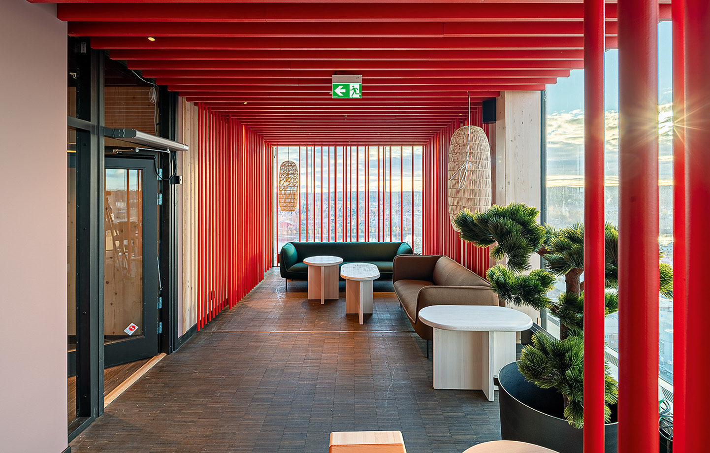Level 19 of The Wood Hotel is the location of the Miss Voon restaurant, with its panoramic views and sky bar. Seating around 70 diners, the restaurant combines the flavours of Asian cuisine with the fundamentals of Scandinavian cooking. The interior, which also draws on Asian and Scandinavian influences, was designed by architect Thomas Sandell, who grew up in Skellefteå. With his stamp on it, the hotel hopes to make Miss Voon a destination in itself.