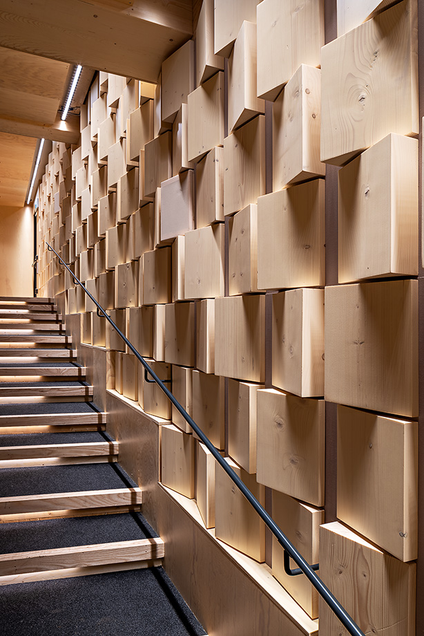 White worked with Brekke & Strand as specialists in acoustics in wooden buildings. This led to solutions that combine highly effective sound insulation between the arts centre and the hotel with the right acoustics in the auditoriums. A prime example of this is the walls in the largest auditorium, which are clad in solid blocks of spruce with a triangular cross-section, made by the Spanish company Frapont. The wooden blocks have been arranged in a 3D parametric morphology that contributes to good room acoustics by reflecting the sound in every direction.