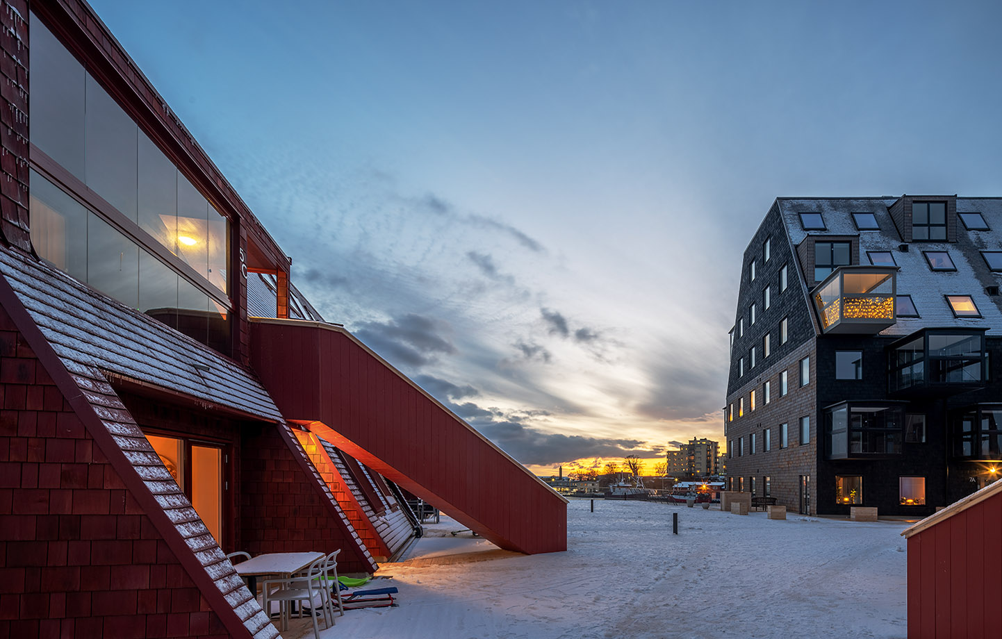 The majority of the walls in Kilströmskaj also form the roof of the building, which has placed particular demands on the building envelope, not least because the site is quite exposed. The chosen solution was cedar shingles coloured red, black and grey. They were also industrially fireproofed using vacuum pressure impregnation, where the fireproofing agent is fixed into the cell structure of the wood.
