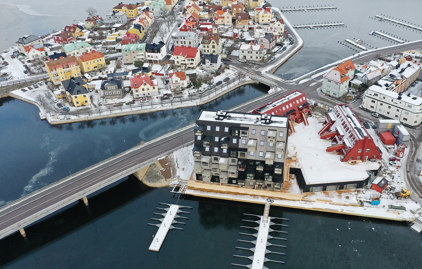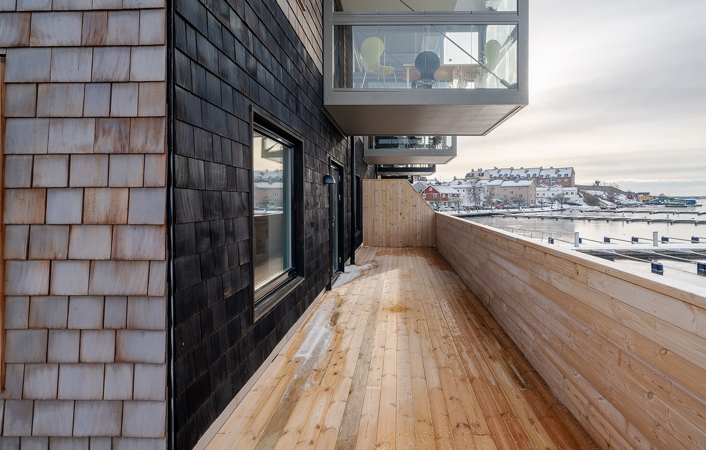 Kilströmskaj lies on a peninsula on the eastern flank of Björkholmen, right next to Saltöbron bridge. The project is the brainchild of Svensk Bostadsutveckling, a subsidiary of SBU Framtid, itself a collaborative enterprise owned by Wingårdhs Arkitektkontor, JSB Construction and Kai-Larsen Affärsutveckling. The company’s mission is to build apartment blocks in wood, with high design ideals, at attractive prices through industrial construction.