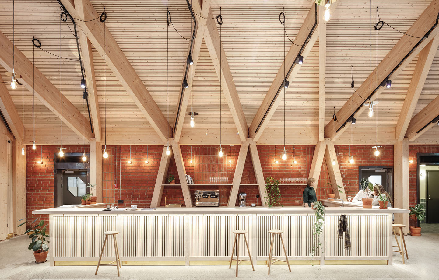 »That and the light coming down through the ceiling are what establishes the ambience. It’s a wide room with a simply supported structure, and we’re exposing the material – you can work out how it’s built. You can see the wood and how it fits together, from the big beams to the finer details.«
