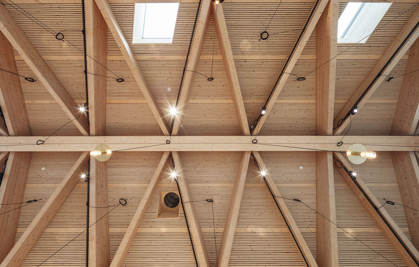The 30 x 30 millimetre spruce battens cladding the ceiling and walls provide a contrast with the monumental roof beams. The wooden cladding around the walls also improves the acoustics. Behind the wooden battens is a cavity that disperses the sound waves.