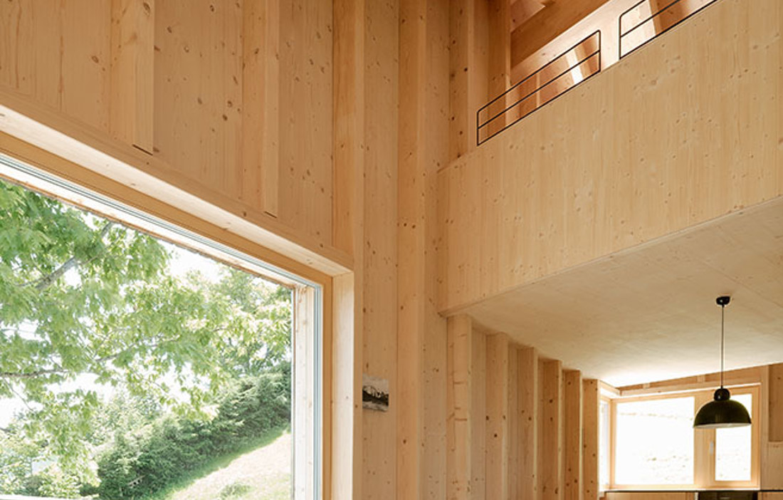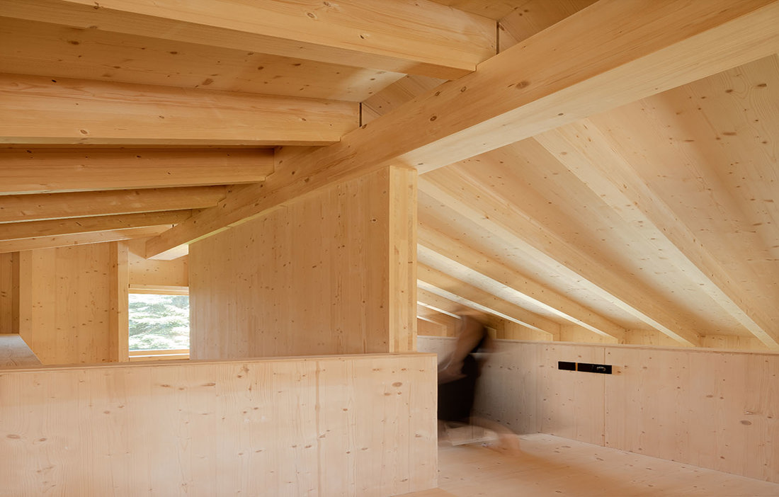 Apart from the concrete foundations, the whole building is wood. The lower floor is a timber-framed structure on top of which rests a CLT floor system. Above that, the topology is reflected in the exterior, with its exposed glulam posts and spruce CLT panels. The internal walls are also made of CLT. Glulam roof beams rest on the posts, supporting a ceiling made of three-ply edge-glued panels. The building is insulated externally and boarded out in timber cladding. As much as possible is made of wood primarily for climate reasons.