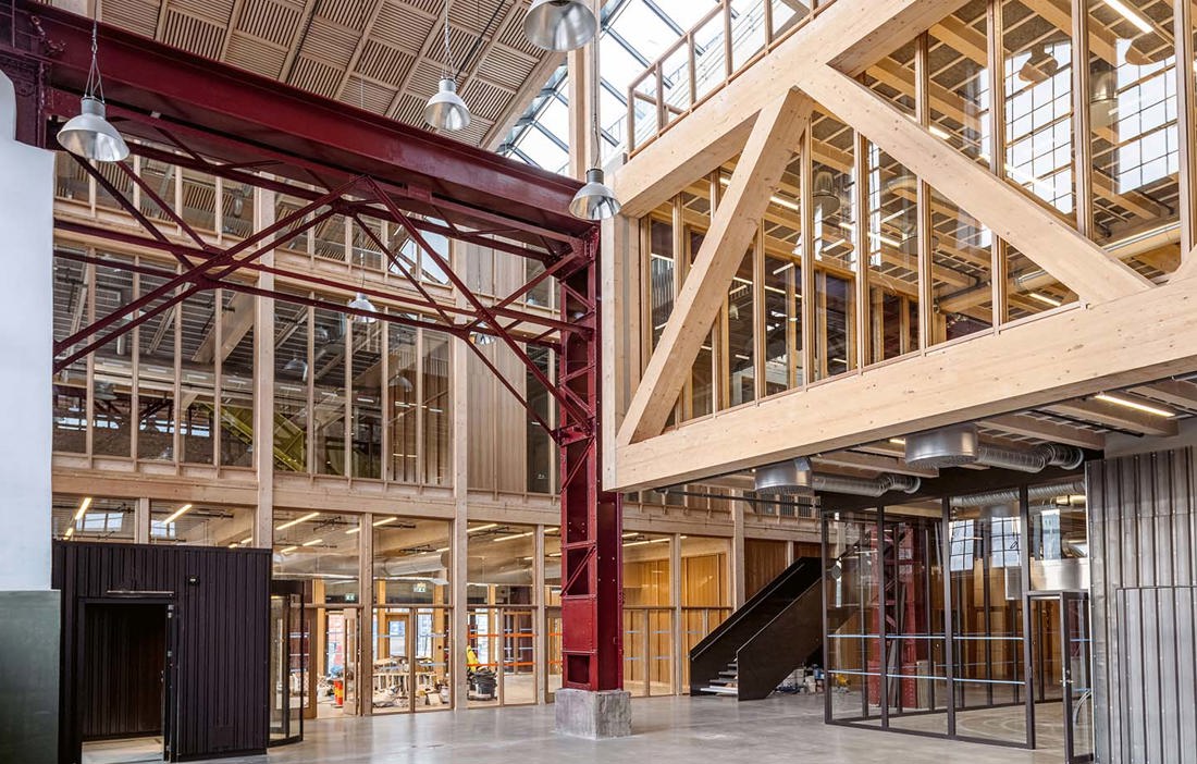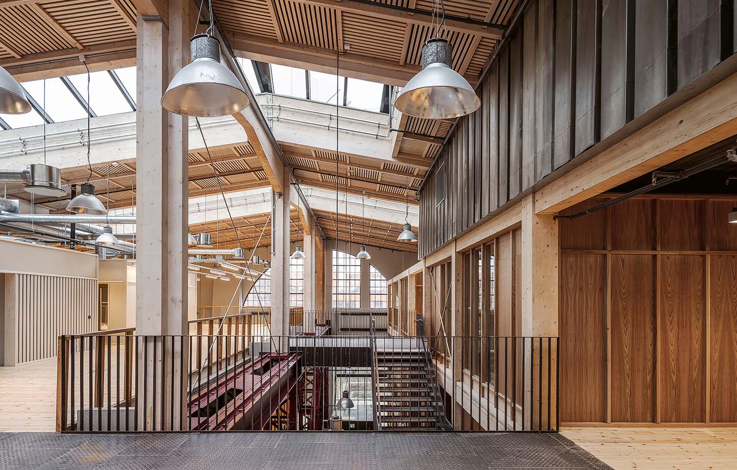 A key idea has been to clarify how the building works, so all the utilities such as electricity, heating, sanitation, ventilation and sprinkler systems are visible. The interior wooden walls help to reduce the contrasts and create a calm and harmonious atmosphere.