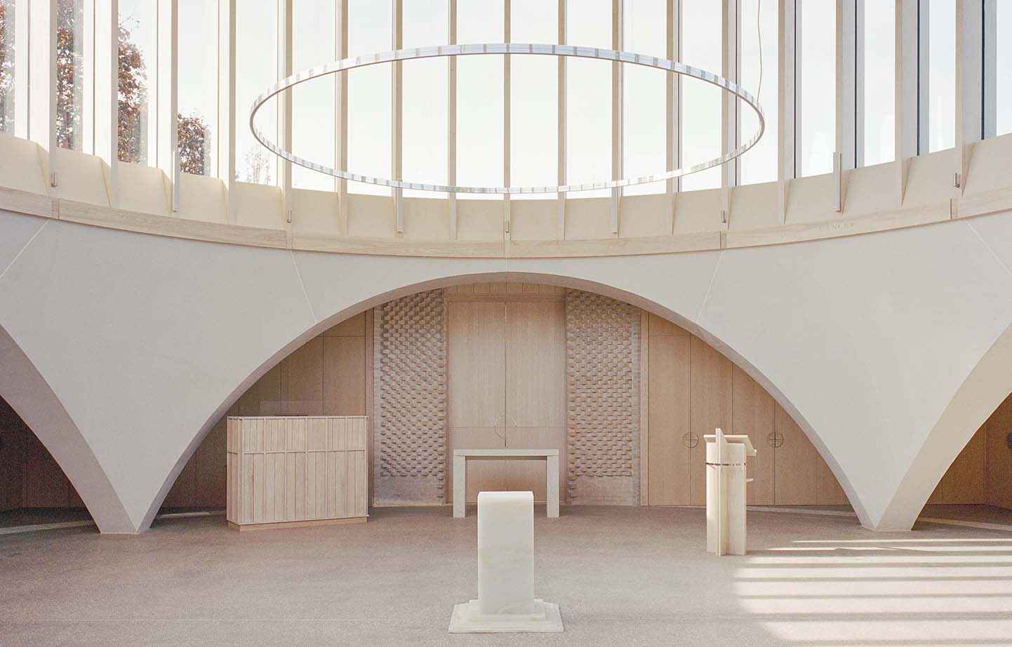 The temple hall itself has the same dimensions as the surrounding contemplation courtyard, to emphasise a symbolic balance between space and void. In the temple, steel has only been used to reinforce the wooden structure of the temple hall and in the beam hangers. The spiritual symbolism is embodied by the architectural encounter between the square – the earth and earthly life – and the circle as a symbol of heaven and holiness.