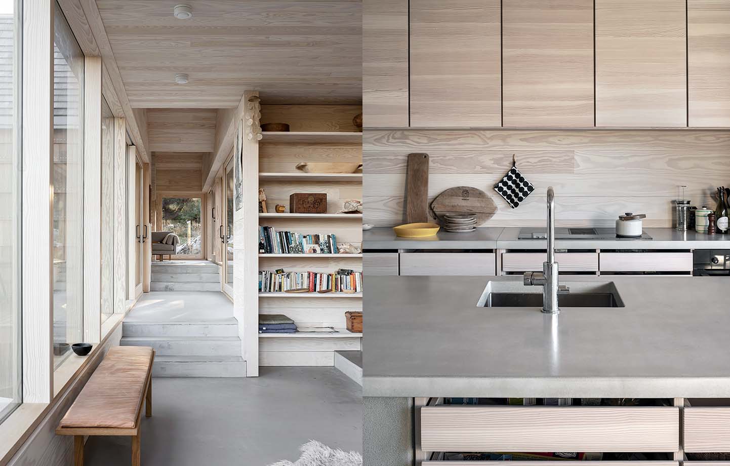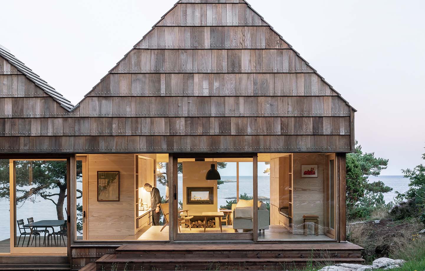 It would perhaps seem logical to take down the gnarled pines that have long grown on the rocky hillside in Saltviga, Norway, to maximise the view of the Skagerrak strait. But instead, the owners of the simple cabin that stood on the site at the time chose to let the pines frame the view by bonsai clipping them: keeping the tops and the lower branches, but cutting everything away just at window height. When the decision was made to replace the old house with a new one, there was no doubt that the pine trees would stay, and the band of glazing had to be adapted to the way the trees were pruned.