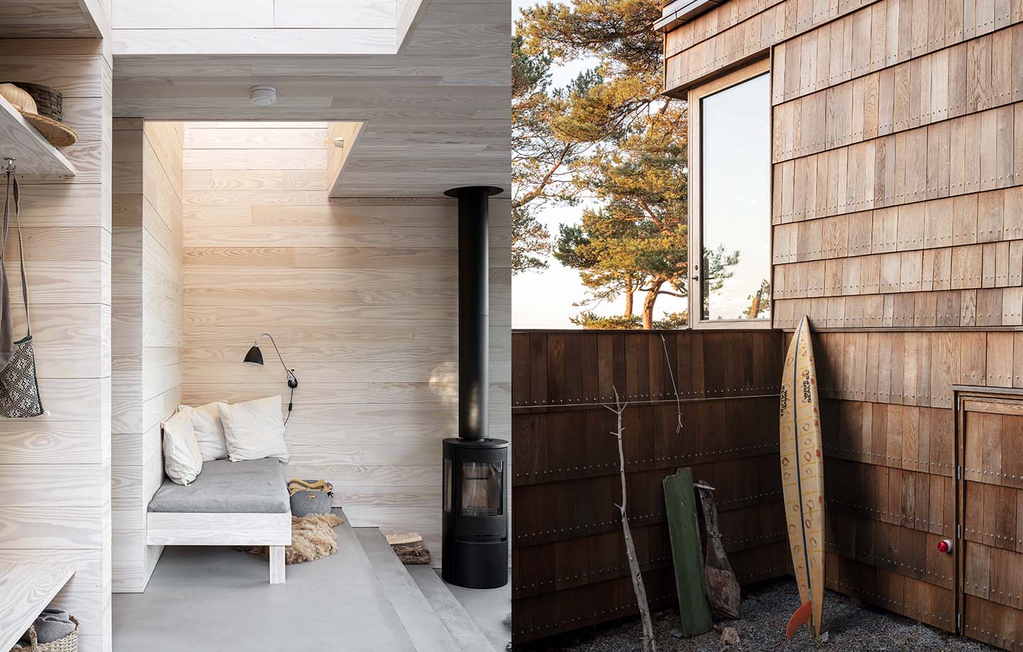 The interior is also clad with larger offcuts from the same supplier, this time Douglas fir that has been mounted flush. The walls and ceiling have been finished with a lime-like paint, moderating the yellowy red of the wood, and the grey floor screed forms a neutral base that subtly breaks up the wood. Another detail is that all the window frames are made of two types of wood – Douglas fir on the inside and oak on the outside – which meet at the glass, allowing them to harmonise with the respective walls inside and out.