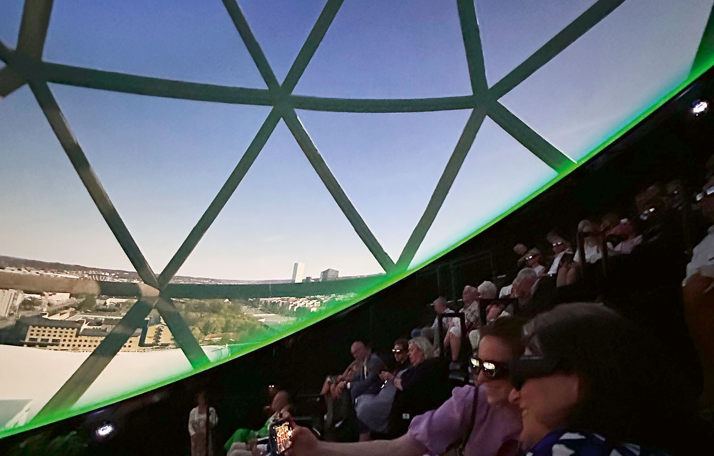 The Wisdome in Gothenburg is the largest of five new visualisation domes in Sweden, the others being in Stockholm (Trä issue 2/23), Malmö, Umeå and Norrköping. Enveloped by a 360 degree and 443 square meter projection screen, the dome’s visitors can enjoy magnificent experiences of space, the sea and the human body in a way that makes it feel like you are immersed in the whole thing – which you very much are.
