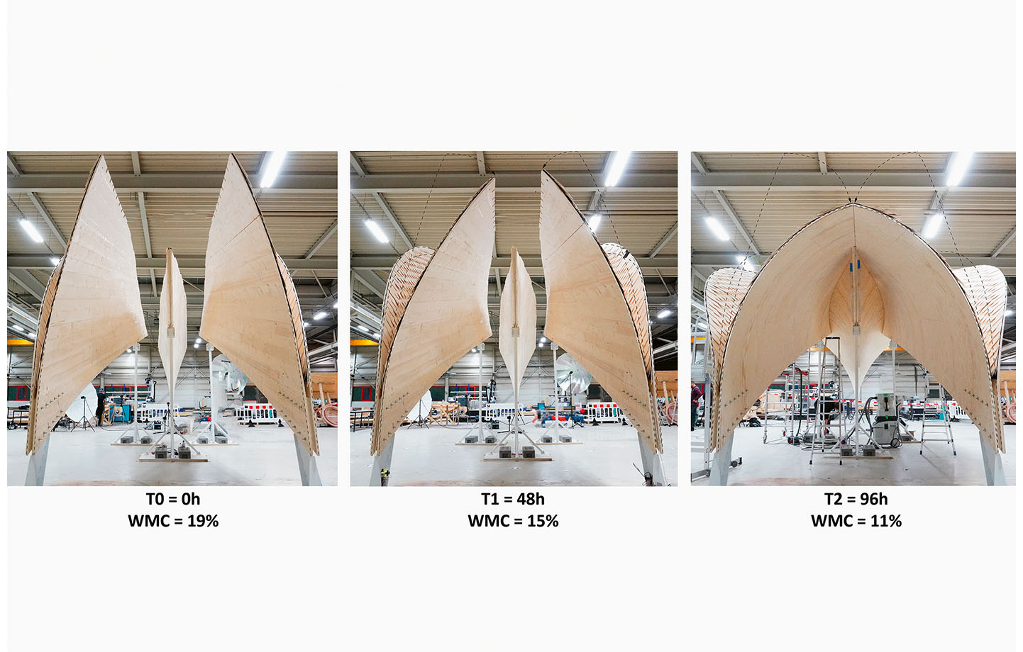 ITECH ’s Hygroshell pavilion, at the 2023 Chicago Architecture Biennial, presented a full-scale experiment on how the moisture content and drying process of wood can be utilised to create shell structures from laminated wood panels that are comparable to their concrete counterparts in the early 20th century. With digital models that take into account the anisotropic moisture properties of wood, Hygroshell was able to develop both new technologies and designs.