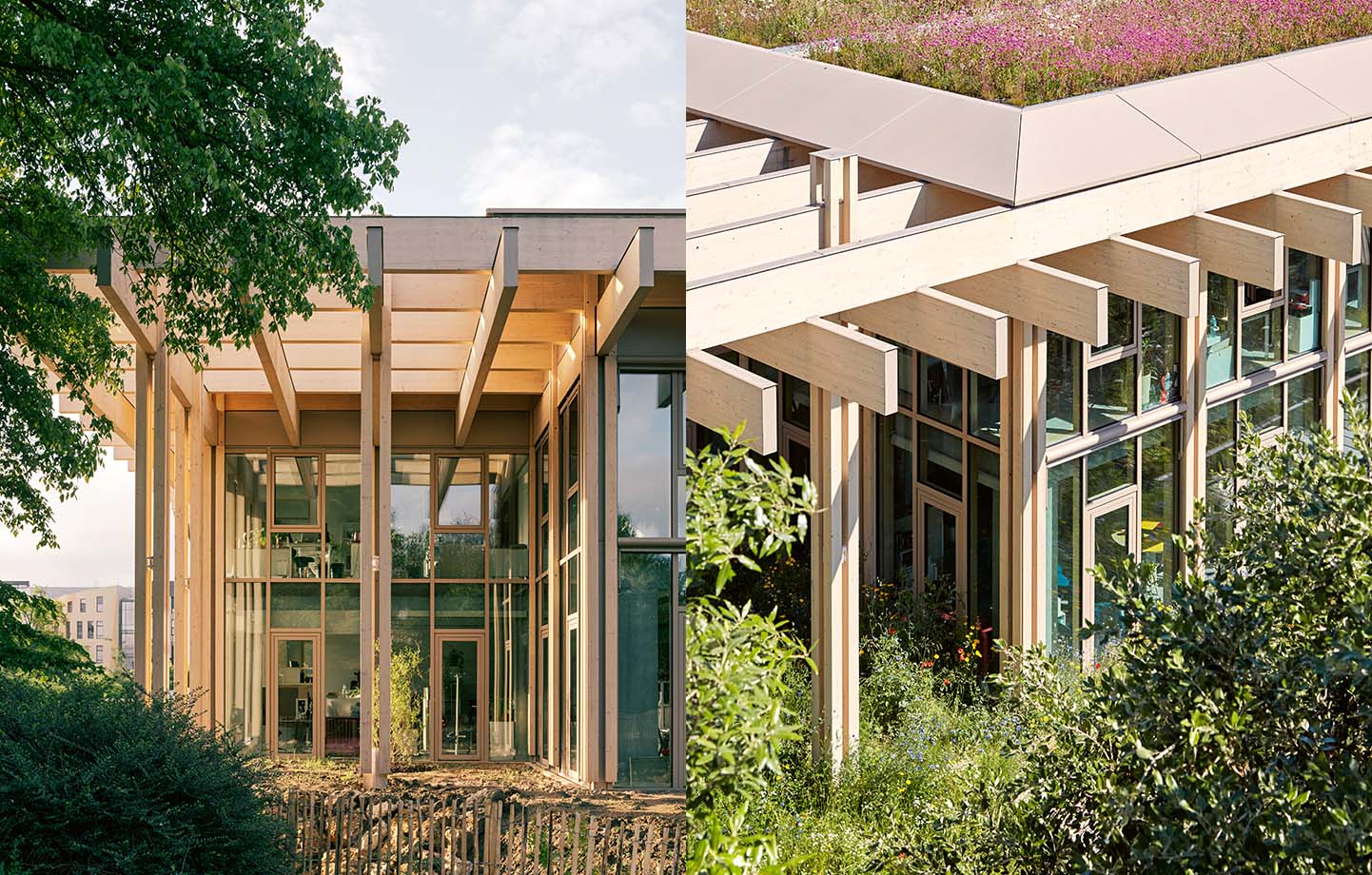 A key feature is the vegetation-clad roof that frames the central glazed section with its integrated photovoltaic cells. The green roof is a major contributor to the building’s ability to blend in with nature. In summer, it becomes a lush meadow studded with grasses, lichens, legumes, native meadow perennials, repeat-flowering bulbs, annuals and biennial flowers.