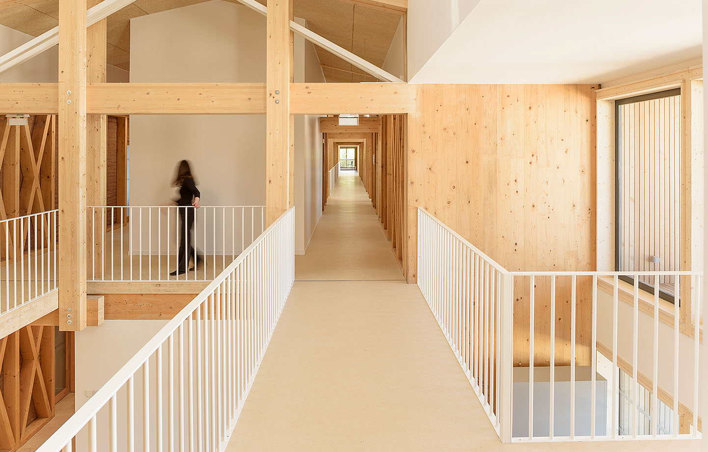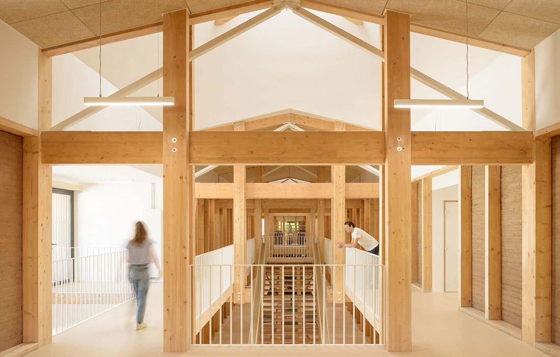 The exposed timber structure of the interior, which has been left untreated and creates a warm feeling in the building, is made of spruce from the neighbouring Vosges Mountains. In addition, earth from the region has been used in the walls.