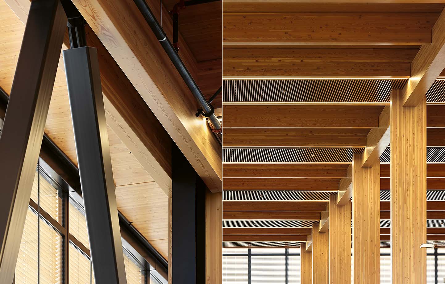 The load-bearing structure consists of a glulam post-and-beam system. In order to withstand the harsh earthquake conditions in California, the carcass has been supplemented with a steel frame that works with the floor system to damp any movement. Since the steel frames are not load-bearing, they could be left untreated. The glulam posts and beams – all made of Douglas fir – have also been left exposed as part of the architectural look. The sprinkler system that runs along the beams is the only visible installation.