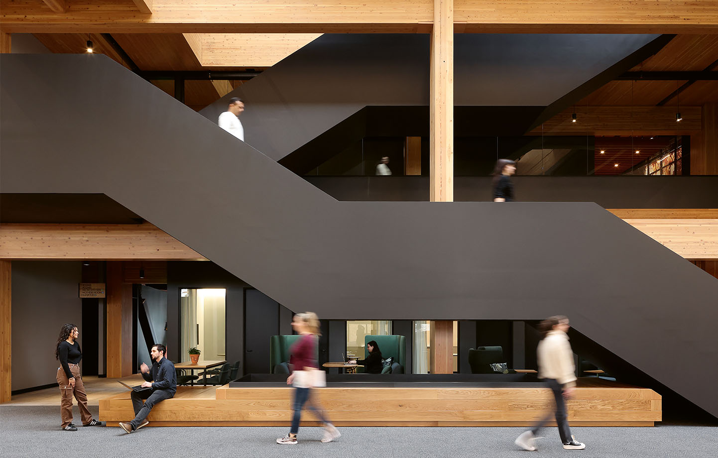Most of the plumbing, ventilation, IT, power and data systems run through the raised service floor. In contrast, the sprinkler pipes and electrical wiring for the lighting are integrated into the ceiling via slots in the CLT panelling. In the double-height floors, solar panel cables and rainwater pipes have also been integrated into vertical notches in the glulam beams.