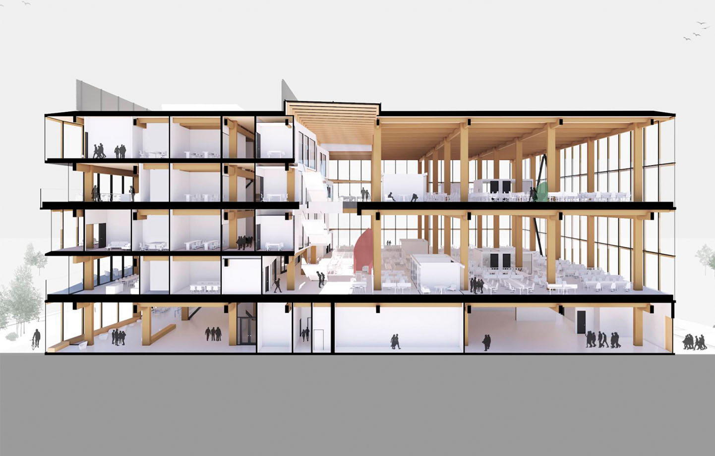The flexible design also means that the building is able to meet new needs as they arise. This ensures that it will be able to stand for a long time and not have to be demolished or completely refitted because of operational changes. Building with wood was an obvious choice right from the start – which is why Michael Green Architecture (MGA) was hired.