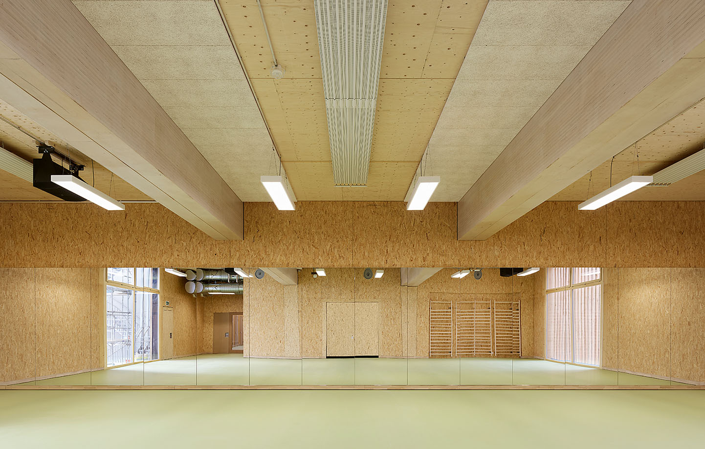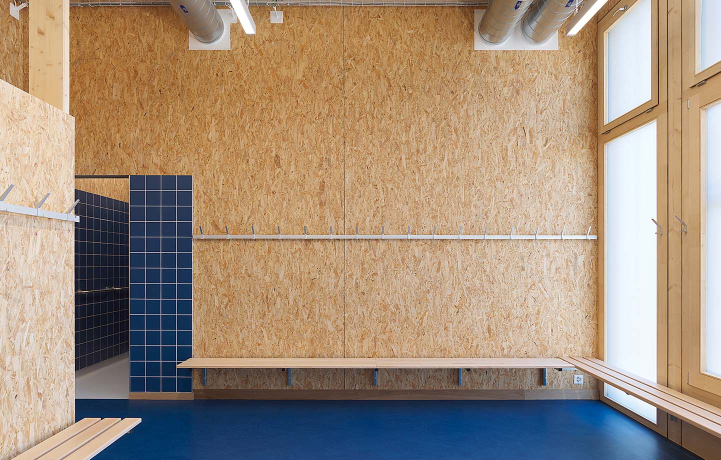 The focus on untreated materials extends from the frame elements to the surface finishes, creating a continuity between the interior and exterior. Perforated panels were used for spaces with acoustic requirements, such as the sports halls – but sparingly even here. The sound level is higher than would have been allowed in a permanent building.