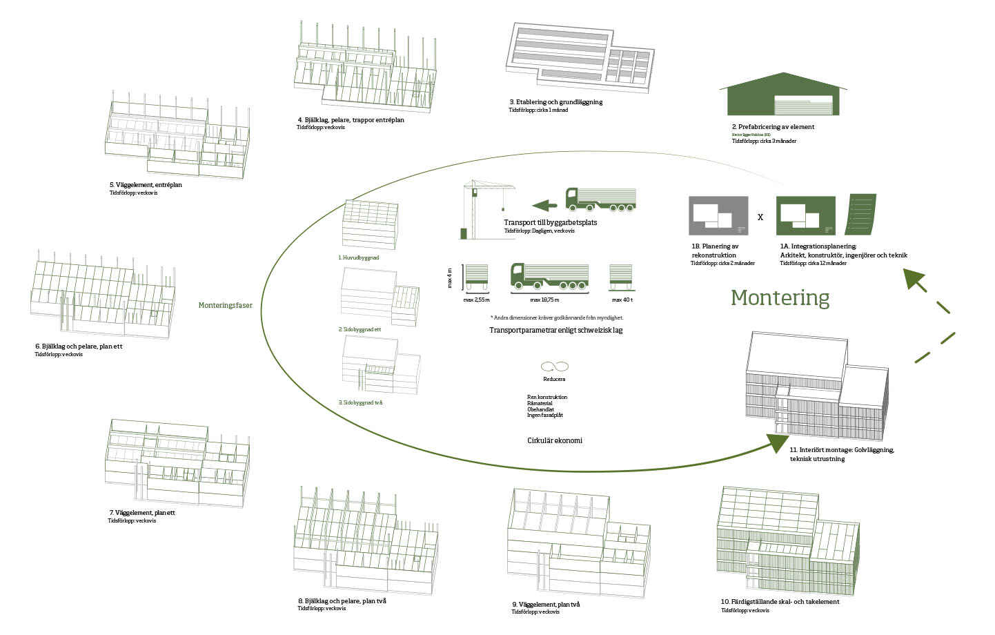 Gloriarank uses several innovative methods to maximise the potential for reuse. Most of the elements are fixed with screws instead of nails or glue, making future dismantling easier. A particularly clever solution was developed for the wet areas in the changing rooms. The waterproofing was installed against an additional layer of wall panelling, screwed to the primary structure, which was then tiled over. When the building is eventually dismantled, the tiled sections can be removed as complete units, leaving the primary structure intact and reusable.