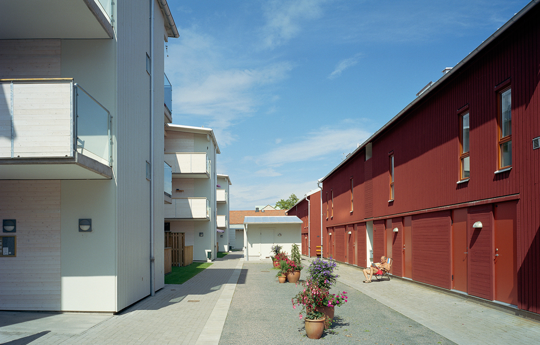 In the heart of Lidköping’s central grid layout stands this Falu red “warehouse”. This housing block, where the apartments on the upper floor project out over the garage on the lower floor, have a unique and modern look, while at same time sympathetically reflecting the older buildings in the city. Taking its reference from farming tradition, the building is split, with the “functional” part at street level having a different style to the residential level above. The architectural features are restrained, skilfully executed and liberatingly free from elements of pastiche.
