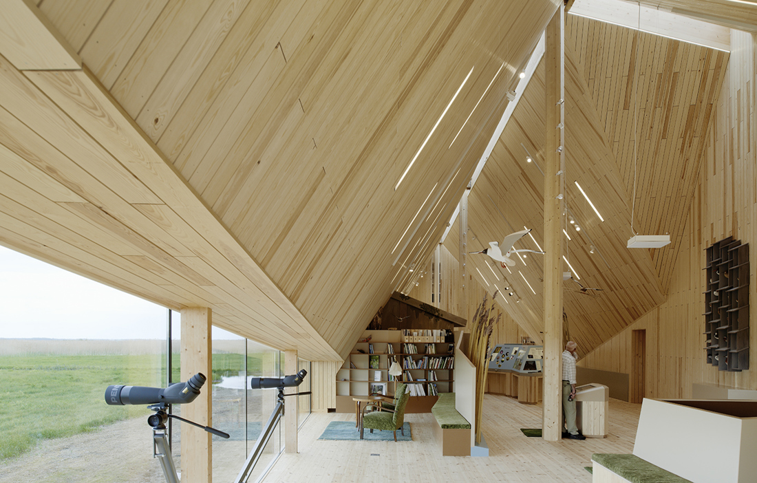 The visitor center Tåkern is shaped like a cut from a reed. Inside there is a large space, facing the view of the birds on the lake and the sky. The folds imitate the movement of the landscape. The design is shaped by the fastidious need of openings. Visitor Center Tåkern was nominated for the Swedish Wood Award in 2016.