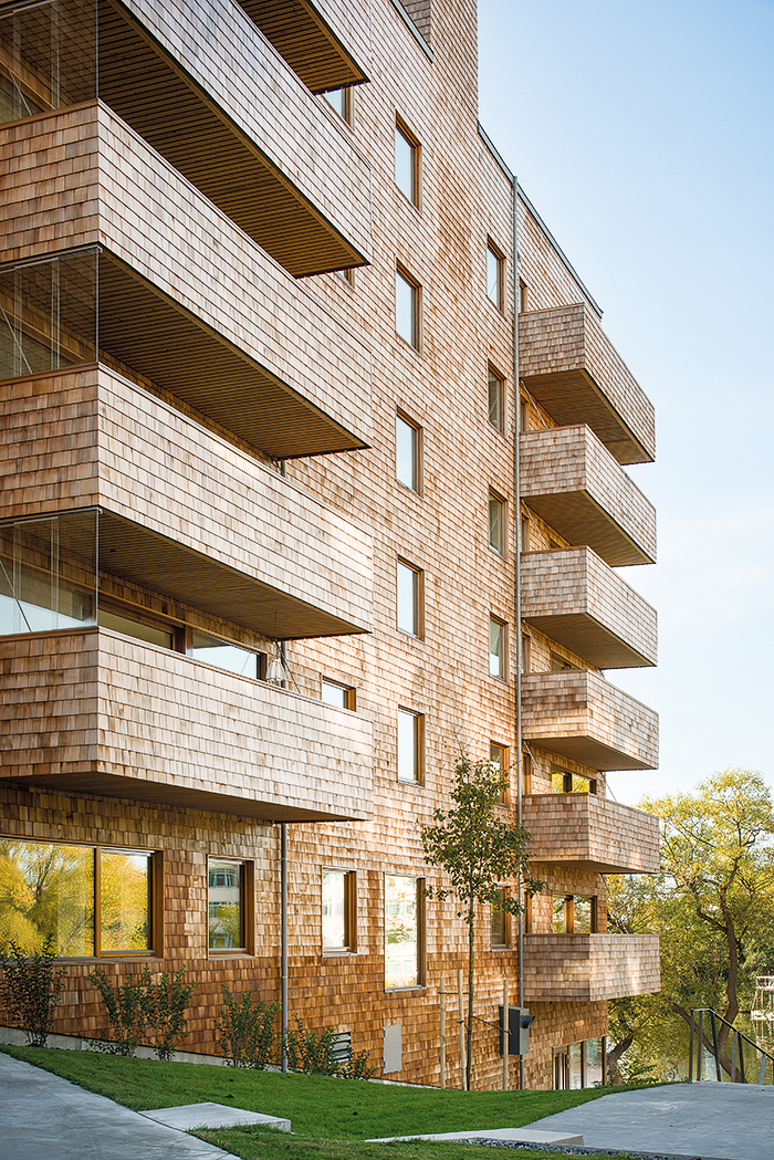 Strandparken’s location on the sunny side of Bällstaviken marked the starting point for the design. Contact with the water, sightlines, the sun, the surrounding area and the mature trees helped to determine the position of the buildings. The steeply pitched roofs of the apartment blocks have discrete eaves. The material count is low and the attention to detail is high. The structural frame is solid wood, with wooden façades that give the buildings a time-honoured and characterful appearance. Balconies with glass ends overlooking the water provide both views and privacy. Large areas of glass, with sliding doors onto the balcony or roof terrace, extend the apartments and give them a sunny outdoor space that offers contact with the water.