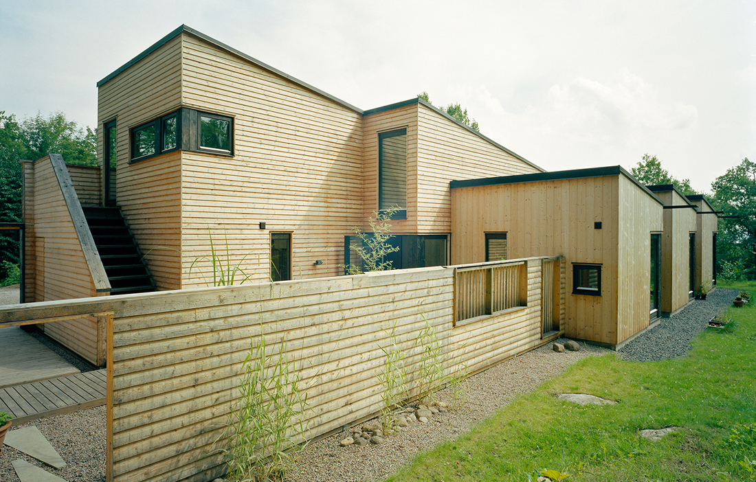 The elongated house sits on top of a hill, with the interior levels following the curves of the land. The slope is also echoed in the gently inclined roof, which gives the building its particular form. The wedge-shaped main body is supplemented with three small cubes, which contain bedrooms. The rather original solution for the layout is based on an orthogonal town plan. Axes lead between and through rooms and towards different outlooks. The austere Japanese front garden is also part of this grid plan. The building makes highly consistent use of wood. Indoors, the walls and ceilings are birch plywood throughout. Externally, the façade is finished in oil-impregnated spruce cladding.