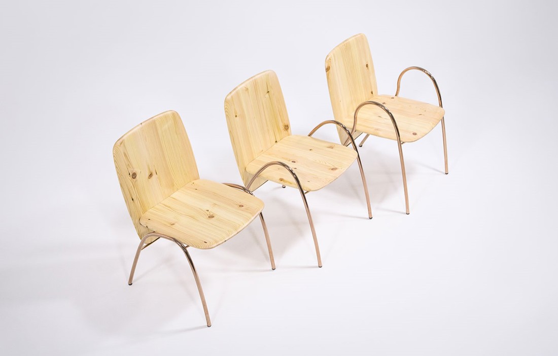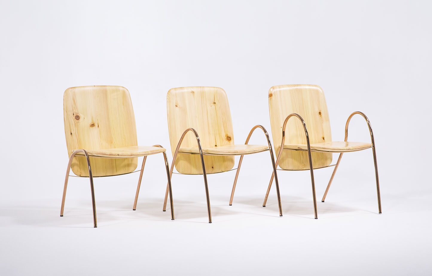 The shape is expressive. The color of the main body is natural and original. The texture and color contrast is sharp between the rose gold titanium coated legs and the pine members. Swedish pine is rustic and gentle while the titanium is fine and firm. The handle behind the backrest is the logo of the chair series and can be a hanger.