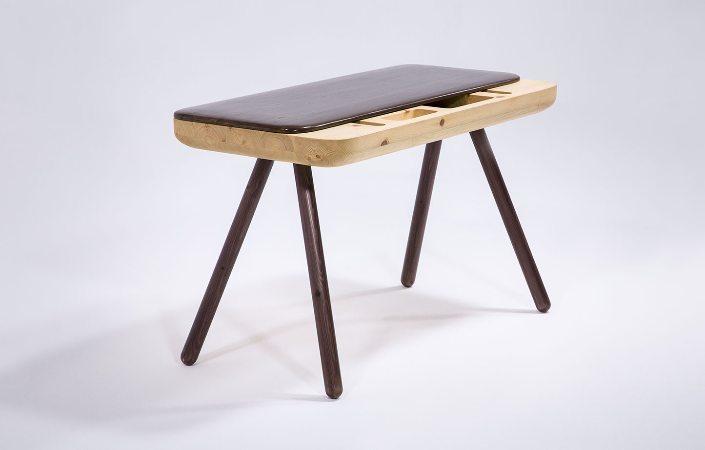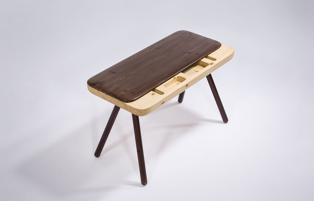 These simple “ponds” can store books, paper, pen, and even wiring board. Considering the structural stability, Wu Wei used bolts inside to connect the table belly and legs. The table top is made of Swedish pine as well. He didn't make in a form so that you can flip it up and down. Instead, he dig out two grooves in the belly. And the table top can slide along the grooves. Users can easily take out stuff when they slide the top. Swedish pine is easy to pigment. Wu Wei painted the table top to distinguish it from the table bell.