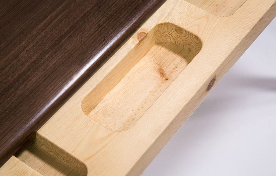 In the May journey, Wu Wei was obsessed with the lakes and ponds of all size in Sweden. These ponds are like natural bowls, containing precious gifts from the nature. He brought back this beautiful impression, and applied it to the design. Given the processability of Swedish pine, he decided to give up traditional storage solution like drawers. Instead, he scooped storage boxes out of a thick piece of wood, resembling ponds in nature.